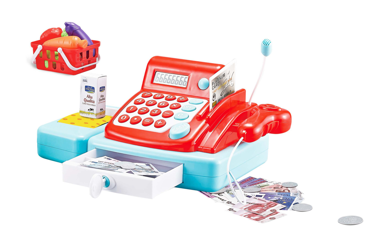 Dotaz na produktPokladna s doplňky s efekty. velikost 33x19x14cm. 2xAA baterie nejsou součástí. Obsahuje pokladnu, košík s potravinami, peníze.