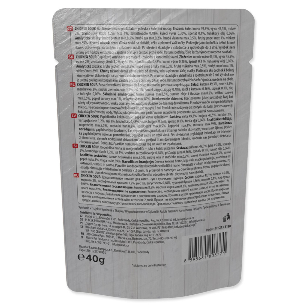 | Složení: | Kuřecí maso 49,3 %, vývar 45,5 %, mrkev 2 %, bramborový škrob 1,2 %, rýže 1 %, zahušťovadlo 0,48 %, kuřecí vývar 0,36 %, špenát 0,1 %, tuňákový olej 0,06 %. |