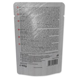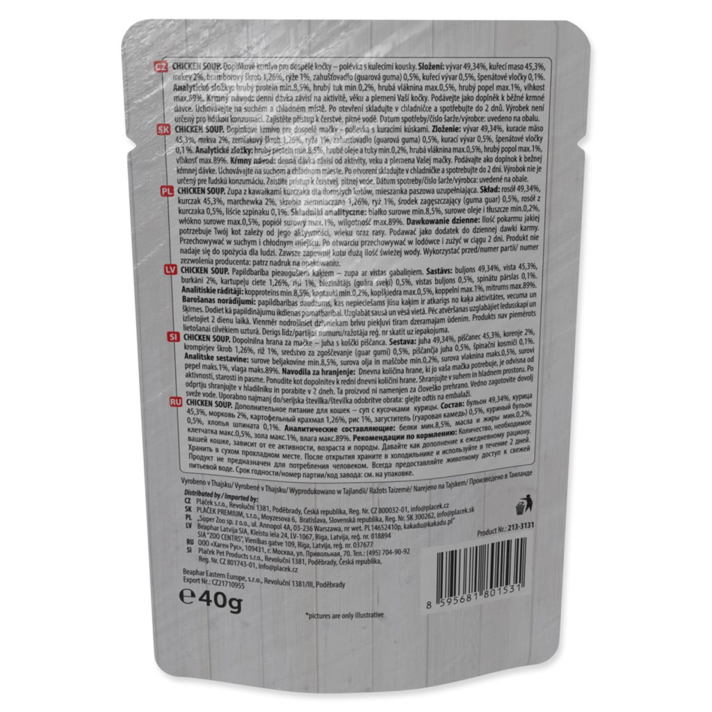 | Složení: | Vývar 49,34 %, kuřecí maso 45,3 %, mrkev 2 %, bramborový škrob 1,26 %, rýže 1 %, zahušťovadlo (guarová guma) 0,5 %, kuřecí vývar 0,5 %, špenátové vločky 0,1 %. |