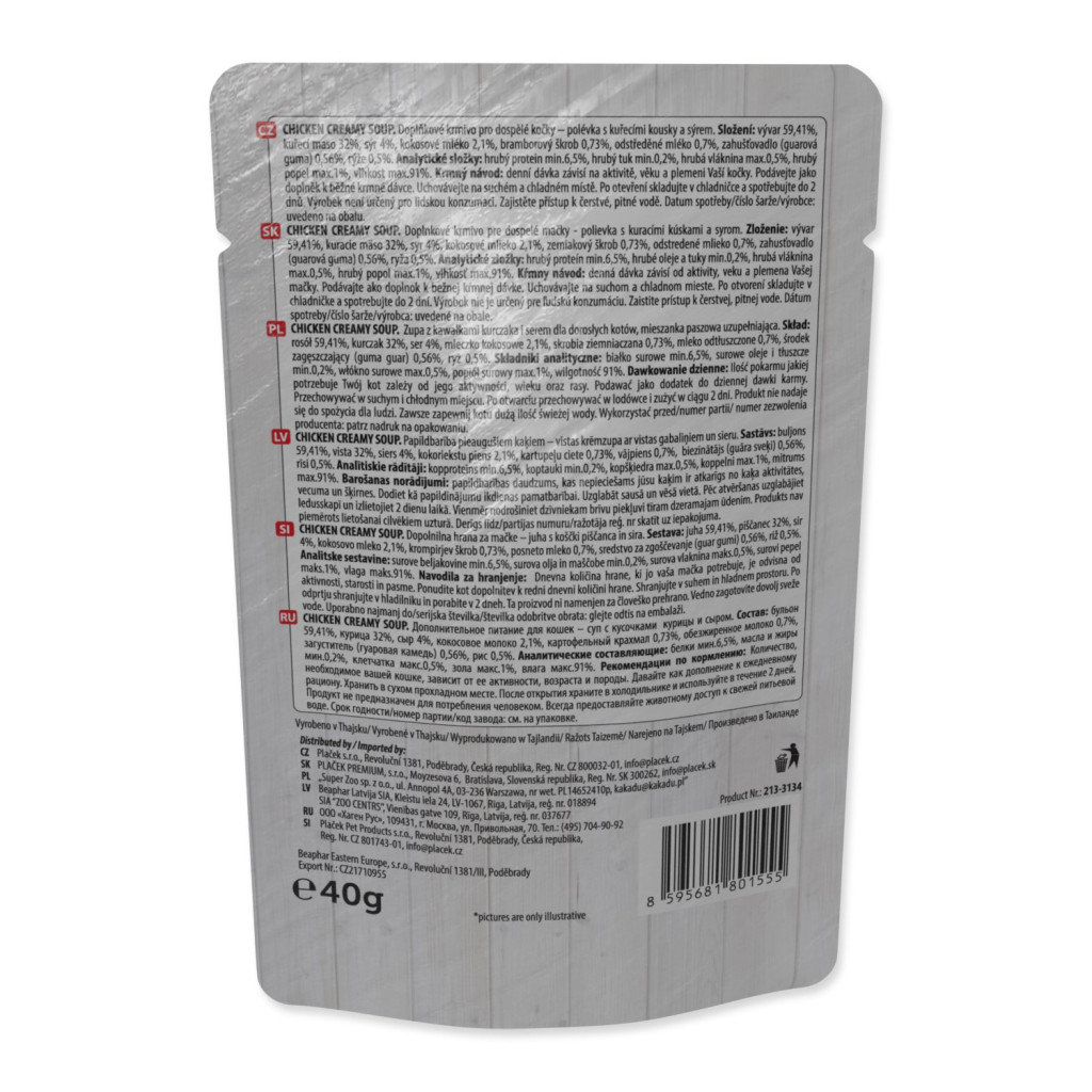 | Složení: | Vývar 59,41 %, kuřecí maso 32 %, sýr 4 %, kokosové mléko 2,1 %, bramborový škrob 0,73 %, odstředěné mléko 0,7 %, zahušťovadlo (guarová guma) 0,56 %, rýže 0,5 %. |