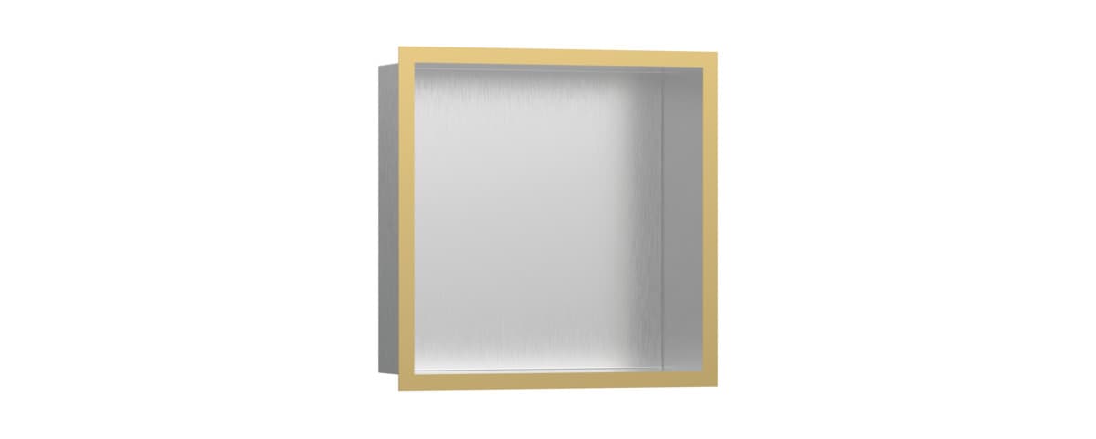 Dotaz na produkt Na splátky ještě dnesVýklenek do stěny XtraStoris Individual o rozměrech 30 x 30 x 10 cm s designovým rámem v leštěném vzhledu zlata od hansgrohe je více než jen vysoce funkční polička do vlhkého prostředí. Korpus z kartáčované nerezové oceli v kombinaci s rámem v leštěném vzhledu zlata promění výklenek do stěny v absolutní designový poklad každé moderní koupelny. Řešení poliček pro sprchy nebo koupelny je perfektně sladěno s produkty hansgrohe FinishPlus a skvěle zapadne do designu místnosti. Výsledkem je exkluzivní, čistý vzhled koupelny.