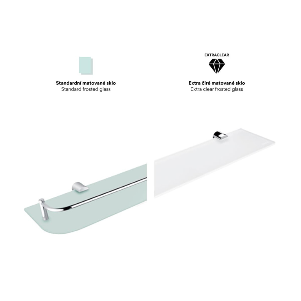Spojení jednoduchosti s čistými liniemi a tvary přesně vystihuje sérii koupelnových doplňků BORMO. Prostý design této řady v sobě skloubil nadčasový vzhled, spolu s funkčností každého výrobku. BORMO nabízí prostředí plné harmonie a jednoduchosti, které z vaší koupelny vykouzlí místo, kde se budete cítit báječně a kde je relaxace zaručena. Sklo police je extra čiré matované. Oproti běžně zeleně zabarvenému sklu je toto zcela bezbarvé. Jeho naprostou bělost zvýrazňuje úprava oboustranného matování. Působí sametově a čistě.