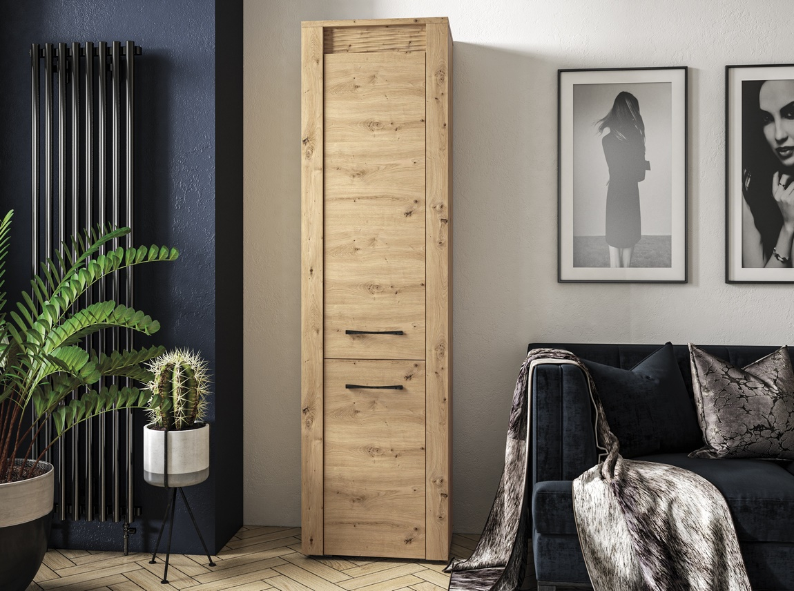 Dotaz na produkt Na splátky ještě dnesPolicová skříň dvoudveřová je vyrobena z kvalitní desky LTD hraněné ABS páskou v barvě dub artisan. Dekorační riflovaná lišta nahoře je z MDF. Dvířka jsou vybaveny systémem tichého dovírání a je možné je namontovat na pravou nebo levou stranu. Úchyty jsou kovové černé. Dodáváme v demontovaném stavu.