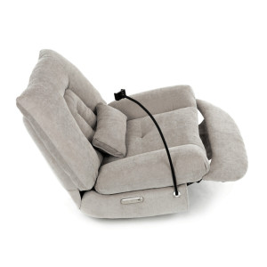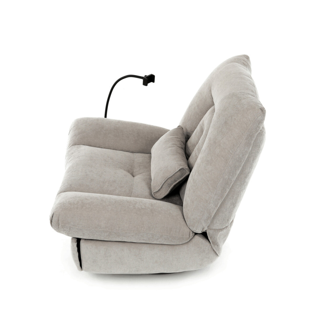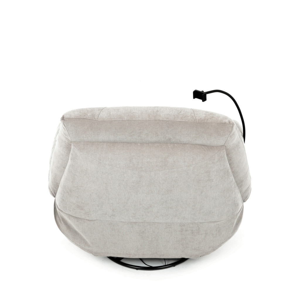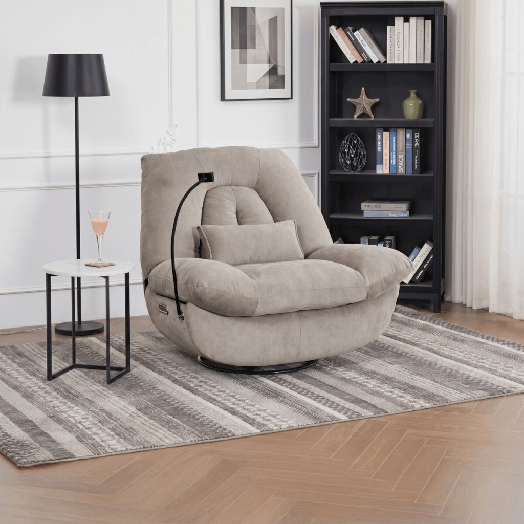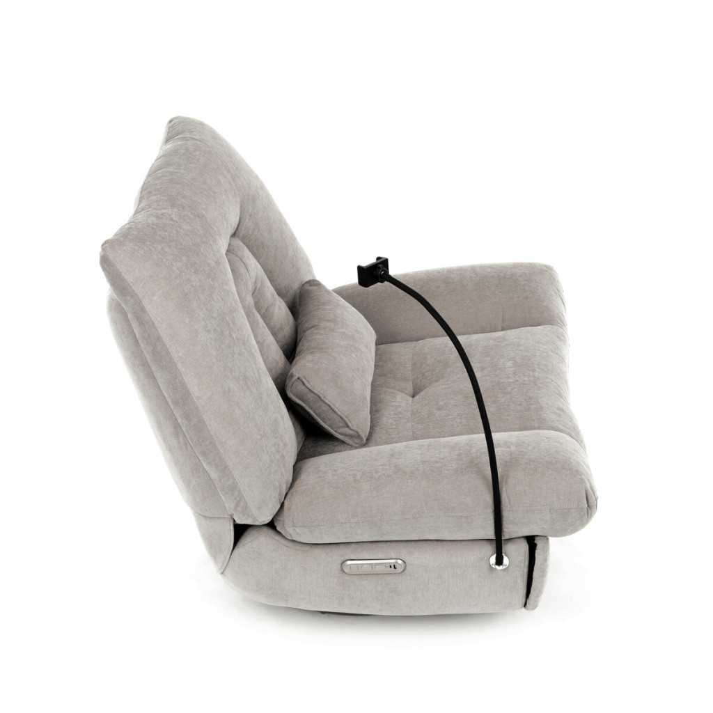 TV křeslo s elektrickým polohováním v béžovém potahu nabízí komfortní sezení s možností nastavení polohy pomocí jednoho motoru. Kovová podnož umožňuje rotaci až do 240° a houpací pohyb o 30°, což přispívá k relaxaci a pohodlí. Zabudované ovládání je doplněno hlasovým ovládáním pro snadné nastavení, zatímco integrovaný Bluetooth reproduktor zajišťuje kvalitní zvukový doprovod. Praktické funkce zahrnují držák telefonu, USB-A a USB-C porty pro nabíjení zařízení a uložný box pro drobné předměty. Pevná konstrukce s nosností 160 kg a ergonomicky tvarované čalounění z lanýžové látky zajišťují dlouhodobý komfort i stabilitu.