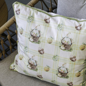 Dotaz na produktPolštář s výplní o rozměru 45 x 45 cm je potažen sametovým polyesterovým materiálem v krémových jarních barvách s velikonočním motivem košíků, vajíček a kuřátek. Sametová tkanina dodává polštáři jemnou a příjemnou texturu, která je zároveň snadno udržovatelná. Výplň zajišťuje dostatečnou měkkost a tvarovou stálost, což přispívá k pohodlí při použití. Dekorativní lemování v zelené barvě rámuje polštář a podtrhuje jeho jarní charakter. Vynikne jako doplněk na pohovce, křesle nebo posteli, kde přinese svěží atmosféru sezóny.