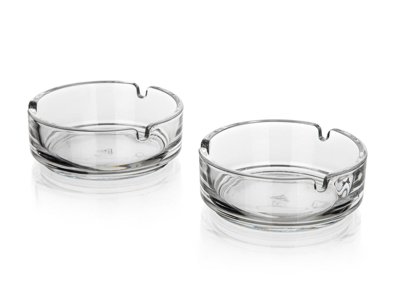 Balení 2 kulatých popelníků z čirého skla.