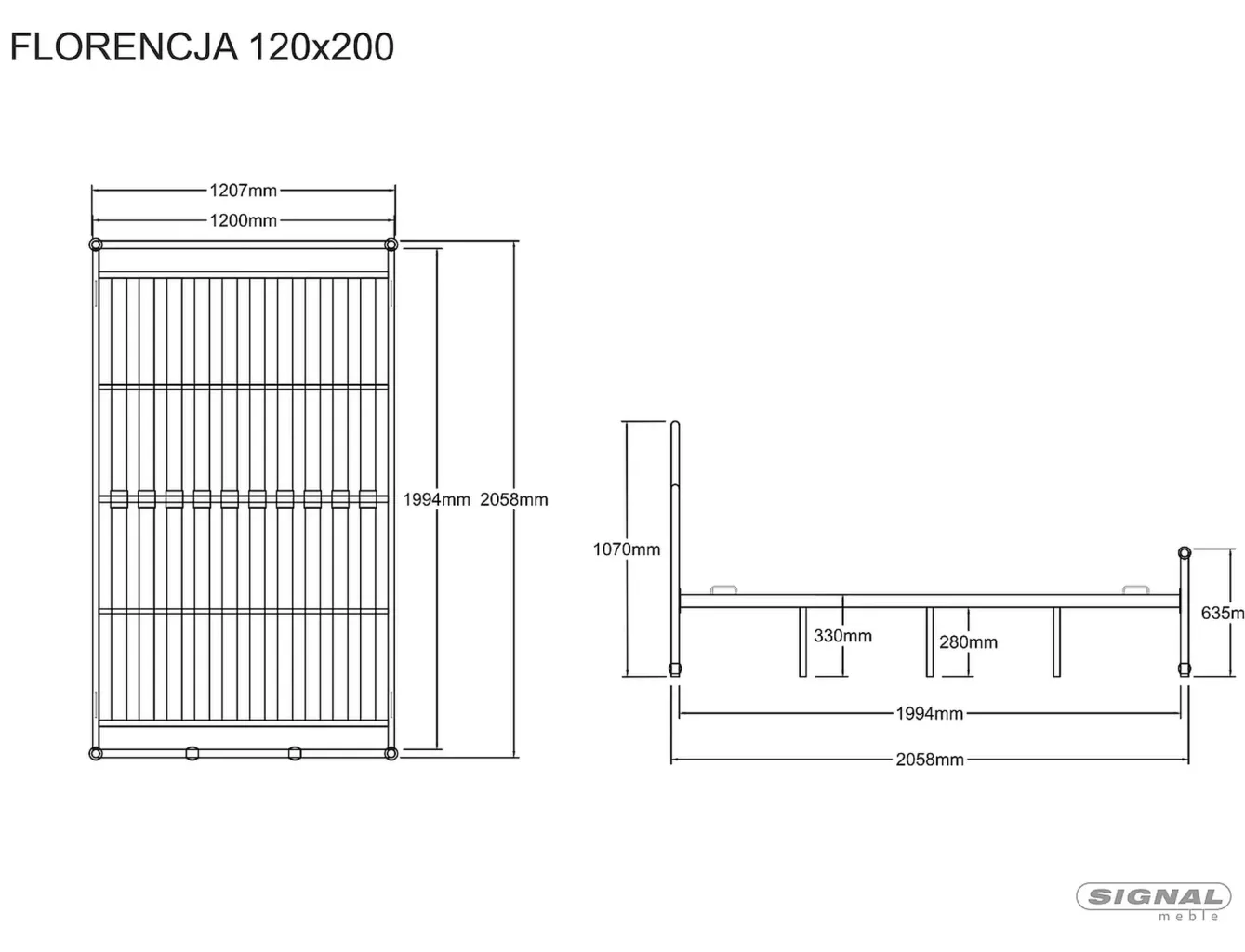 Rozměry postele: A - 206, B - 121, C - 120x200, D - 28, E - 3, F - 5, G - 64, H - 101 cm.
