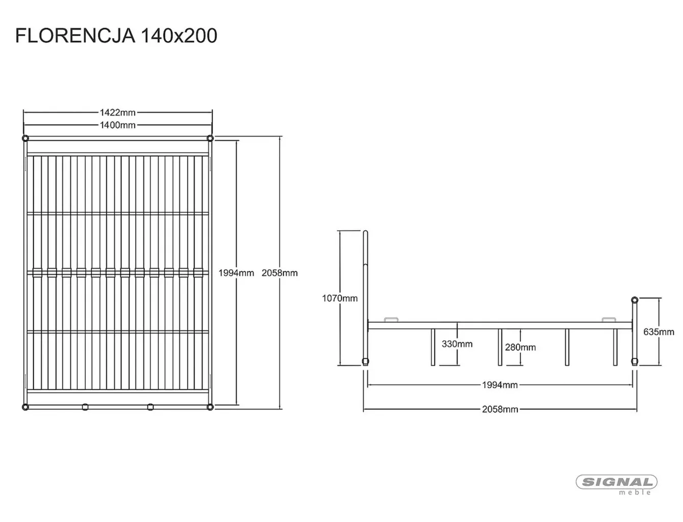 Rozměry postele: A - 206, B - 142, C - 140x200, D - 28, E - 3, F - 5, G - 64, H - 101 cm.