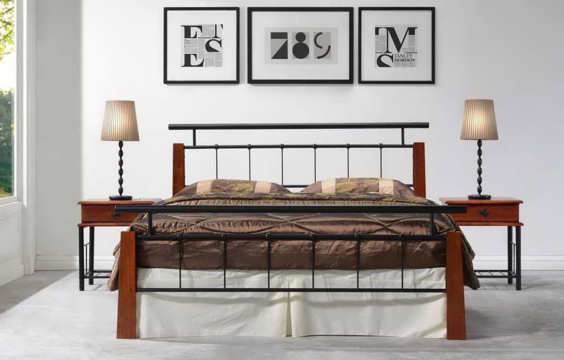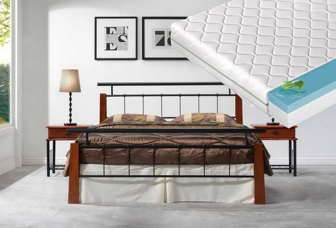 Popis postele - Elegantní postel v klasickém stylu. Zajímavá kombinace kovu a dřeva. Kvalitní masivní dřevo je v barevném provedení antická třešeň. Rám je kovový, tak jako i originální mříže v černé barvě na předním i zadním čele. Dřevěné lamely jsou vsazeny do kovového rámu postele. Rošt je cca 27,6 cm nad zemí. Výška při nohách - 63 cm. Rozměry postele - výška 103,7 cm, hloubka 210 cm a šířka 190 cm.