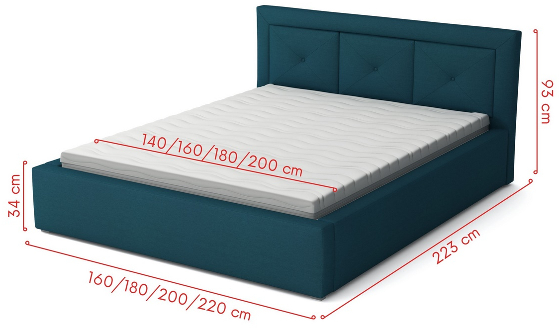 Elegantní postel s vysokým prošívaným čalouněným čelem s ozdobnými knoflíky. Nožky jsou plastové v šedé barvě. Rošt je v ceně, ale matrace je potřeba doobjednat. Vhodný rozměr matrace je 160 x 200 cm nebo dvě matrace 80 x 200 cm. Za příplatek je možné objednat postel s kovovým zvedacím roštem, tím vznikne pod ložnou plochou úložný prostor. Cena za postel s kovovým roštem na vyžádaní. Změnu roštu je nutné zadat při první objednávce. Výška bočnice od země je 34 cm, výška roštu od země je cca 24 cm. Dodáváme v demontovaném stavu.
