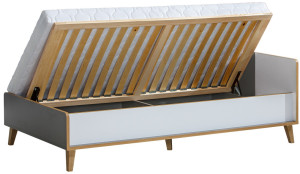Postel s lamelovým roštem, který je v ceně. Matraci lze objednat - vhodný rozměr 90 x 195 cm. Tento styl nábytku zaujme každou mladší generaci. Barevné zpracování tvoří kombinace barev antracit, bílá briliant, dub riviera. Nábytek je vyrobený z kvalitního lamina s ABS hranou. Nohy postele jsou z odolného plastu. Dodáváme v demontovaném stavu.
