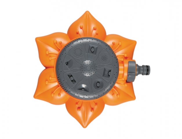 Dotaz na produktPlastový kruhový postřikovač s podstavcem ve tvaru květu. 8 poloh, bez otáčení. Barva: oranžovo šedá.