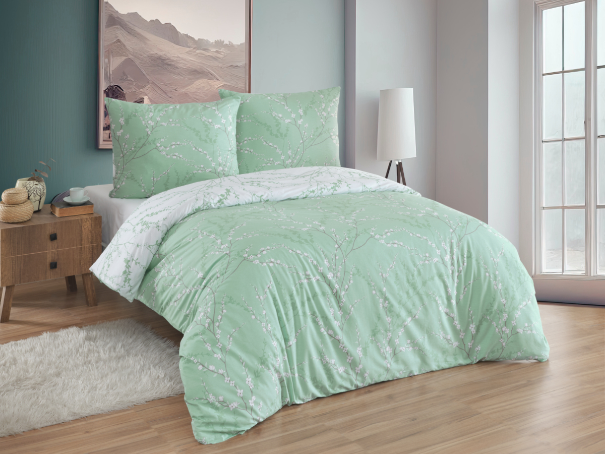 Elegantní oboustranné povlečení s jemným vzorem větviček a drobných bílých kvítků přináší svěží a harmonický vzhled do každé ložnice. Z jedné strany má uklidňující světle zelený podklad, z druhé strany čistě bílý – snadno tak změníte vzhled postele podle nálady. Celek vyvolává dojem lehkosti jarního vánku a přináší ložnici přírodní, sofistikovanou atmosféru.
