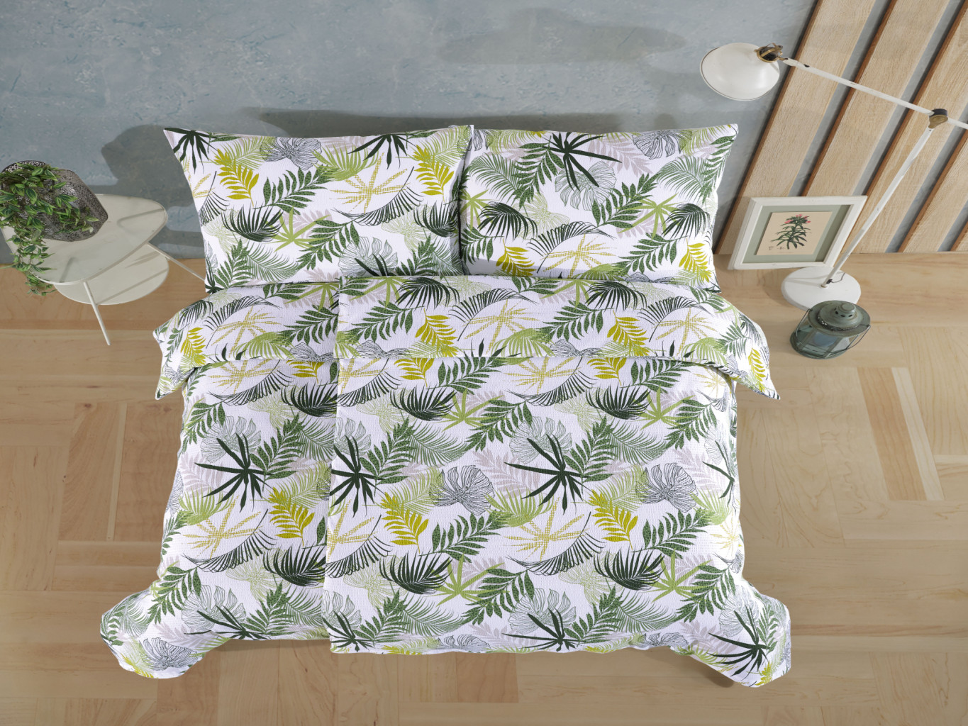 Povlečení Tropical přináší do ložnice svěží nádech tropické přírody. Dominantním motivem jsou bohaté listy palem a exotických rostlin v různých odstínech zelené – od světlé limetkové až po hlubokou tmavou zeleň. Jemné detaily v šedých a přírodních tónech dodávají vzoru lehkost a elegantní vyváženost. Bílý podklad krásně zvýrazňuje rostlinný motiv a zároveň působí čistě a vzdušně. Toto povlečení je ideální volbou pro milovníky přírody a moderního designu. Oživí každý interiér, navodí pocit klidu a promění ložnici v příjemnou oázu odpočinku.
