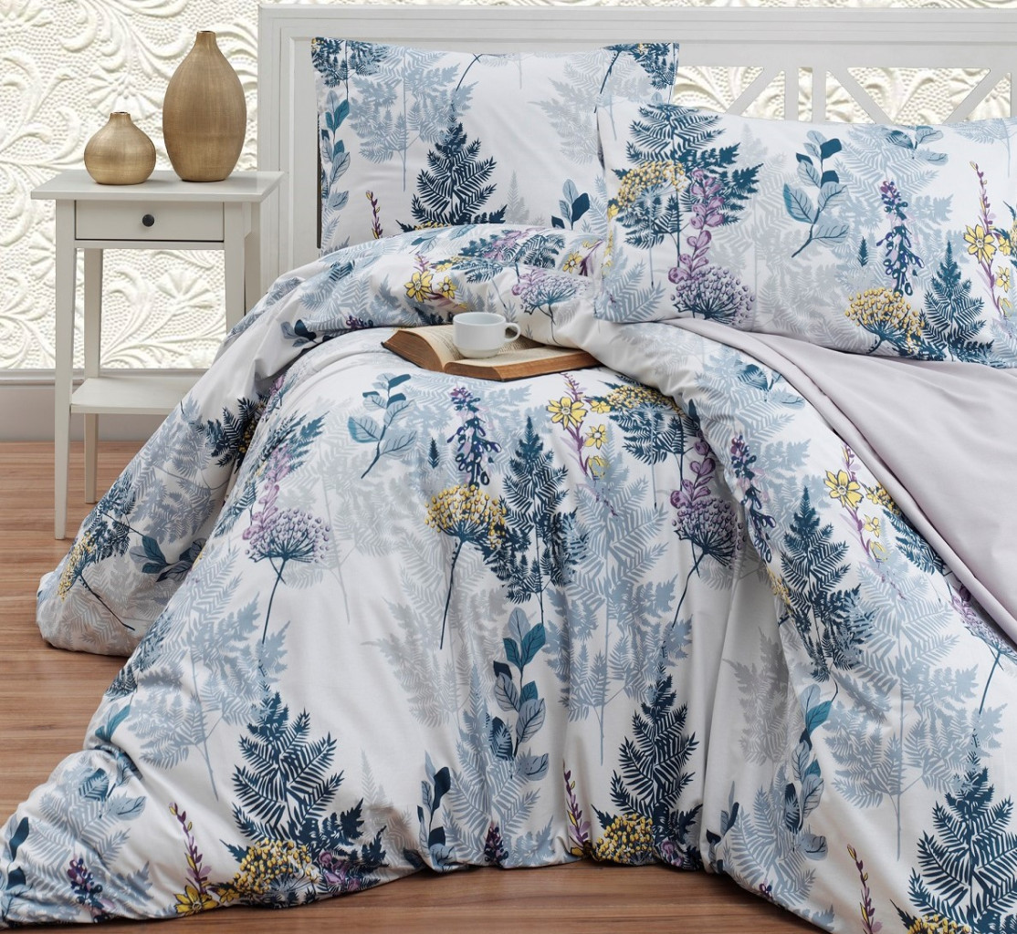 Povlečení Wood grey má přírodní a jemný vzhled inspirovaný botanickými motivy. Na bílém podkladu se prolínají vzory různých druhů rostlin, listů a květů v odstínech modré, šedé, fialové a žluté. Hlavní motivy tvoří jemné kontury kapradin a květů, které působí lehce a vzdušně. Vzor má zároveň mírně vintage vzhled, což může připomínat klasické botanické ilustrace. Povlečení skvěle zapadne do do ložnic, které jsou zařízeny v přírodním nebo skandinávském stylu, a dodá místnosti svěžest a jemnou eleganci.