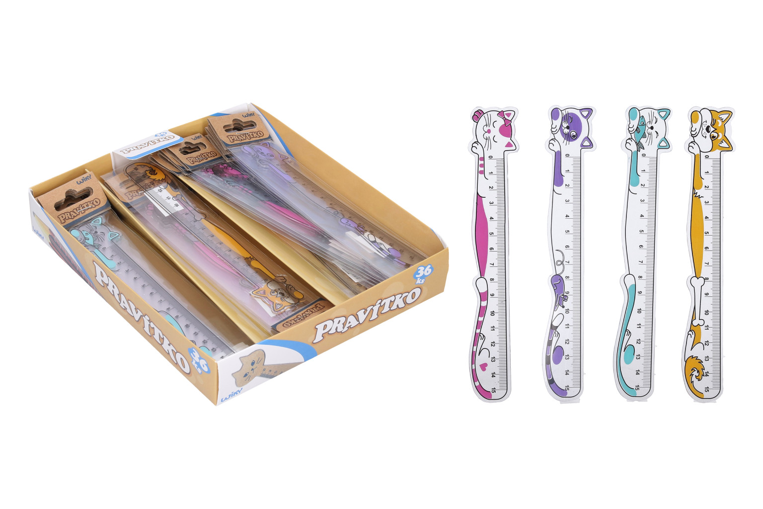 Dotaz na produktPravítko 15 cm - Kočka, 4 barvy - fialová, růžová, tyrkysová, oranžová v boxu 36 ks