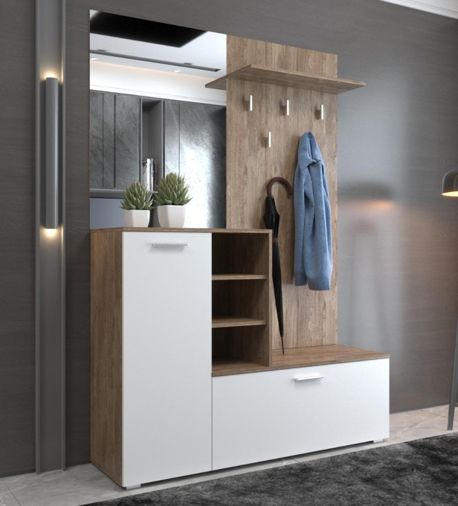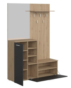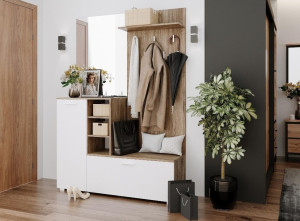 Dotaz na produkt Na splátky ještě dnesPředsíňová sestava poskytuje praktické a stylové řešení pro vaši předsíň. Barevné provedení je dub Ansberg tmavý/bílá mat. Sestava obsahuje - věšáky, odkládací police, skříňky na boty, zrcadlo, otevřené police. Materiál je kombinace LTD 22 a 16 mm. Je navržena tak, aby přinesla pořádek a styl do vašeho vstupního prostoru. Dodáváme v demontovaném stavu.