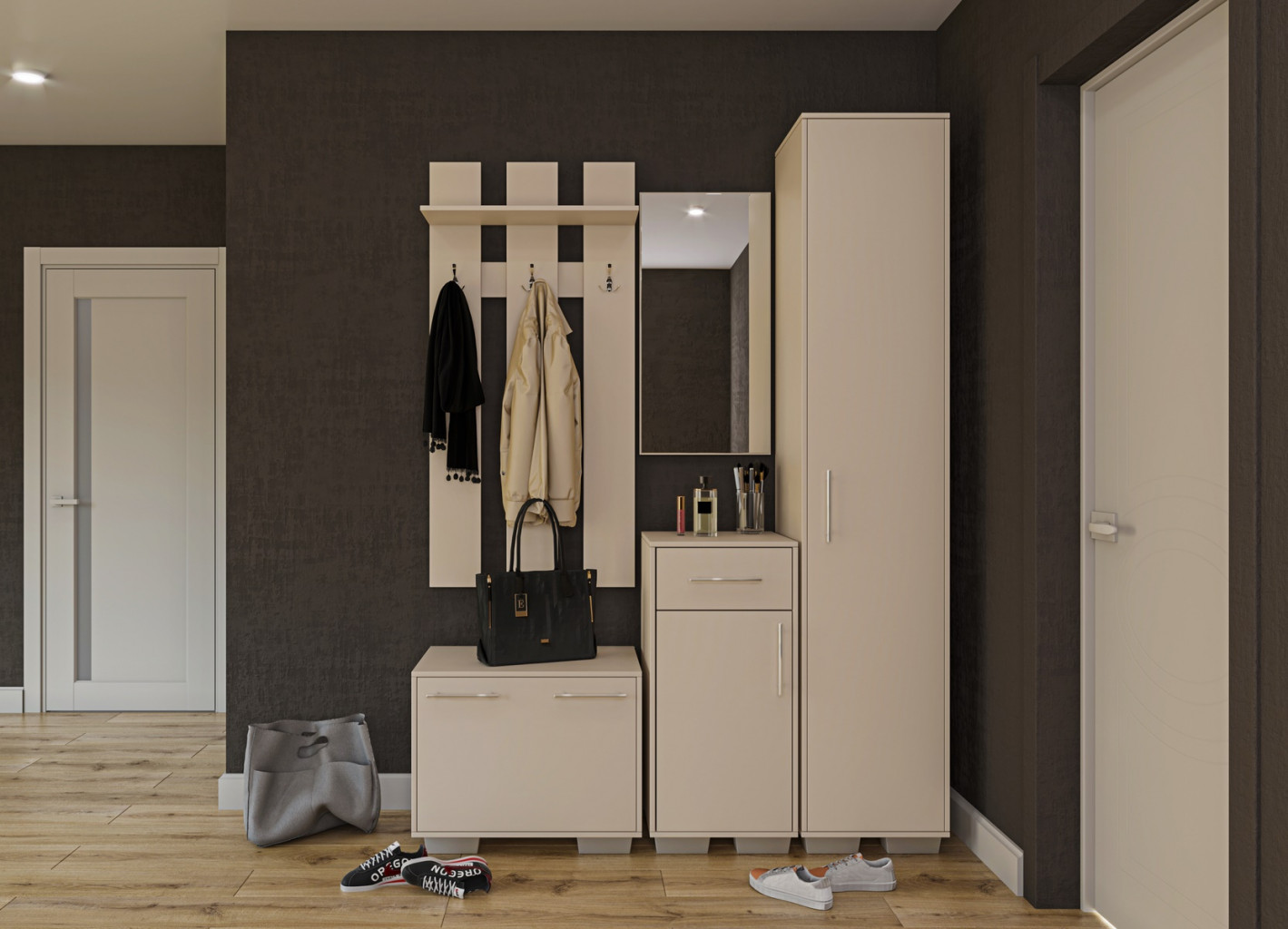 Dotaz na produkt Na splátky ještě dnesModerní předsíňová sestava v barevném provedení satin se stane výrazným prvkem každé místnosti. Nábytek je vyroben z kvalitního lamina hraněného melaninem. Sestava se skládá z věšáku, zrcadla, uzké skříně, botníku a komody se zásuvkou. Rozměry viz obrázky. Tato stěna se prodává jen jako sestava, jednotlivé díly nelze koupit zvlášť. Dodáváme v demontovaném stavu.