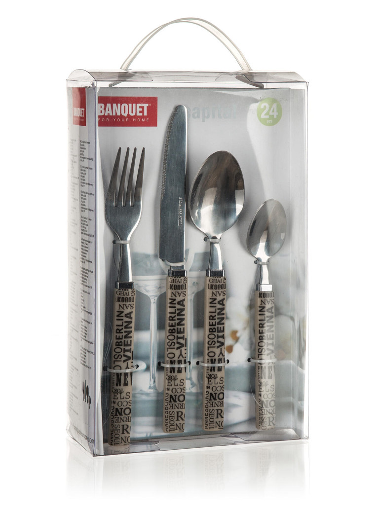 Dotaz na produktSada příborů CAPITAL 24 dílů obsahuje: 6x polévkovou lžíci, 6x vidličku, 6x jídelní nůž a 6x čajovou lžičku. Povrchová úprava lesk, nerez 18/0 o síle 1,8 mm, plastové držadlo s dekorem. Příbory nejsou vhodné do myčky nádobí.