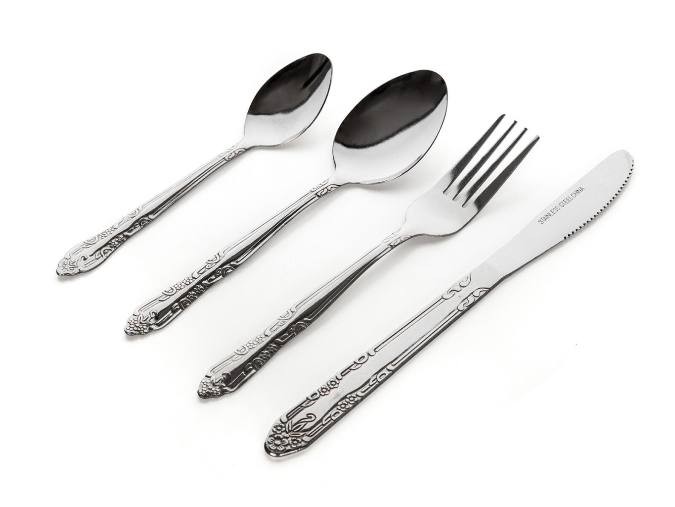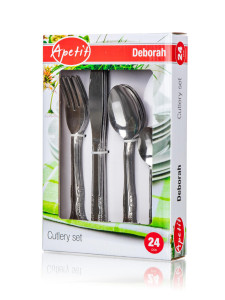 Dotaz na produkt24dílná sada příborů APETIT DEBORAH se skládá: vše po 6 ks - nůž 20,9 cm, vidlička 17,6 cm, lžíce 17,3 cm, čajová lžička 13,2 cm. Povrchová úprava: tumble polish, tloušťka nůž: 2,5 mm, vidlička / lžíce / lžička : 1,5 mm.
