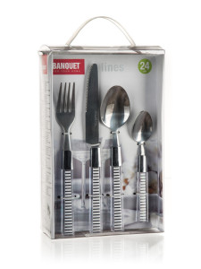 Dotaz na produktSada příborů LINES 24 dílů obsahuje: 6x polévkovou lžíci, 6x vidličku, 6x jídelní nůž a 6x čajovou lžičku. Povrchová úprava lesk, nerez 18/0 o síle 1,8 mm, plastové držadlo s dekorem. Příbory nejsou vhodné do myčky nádobí.