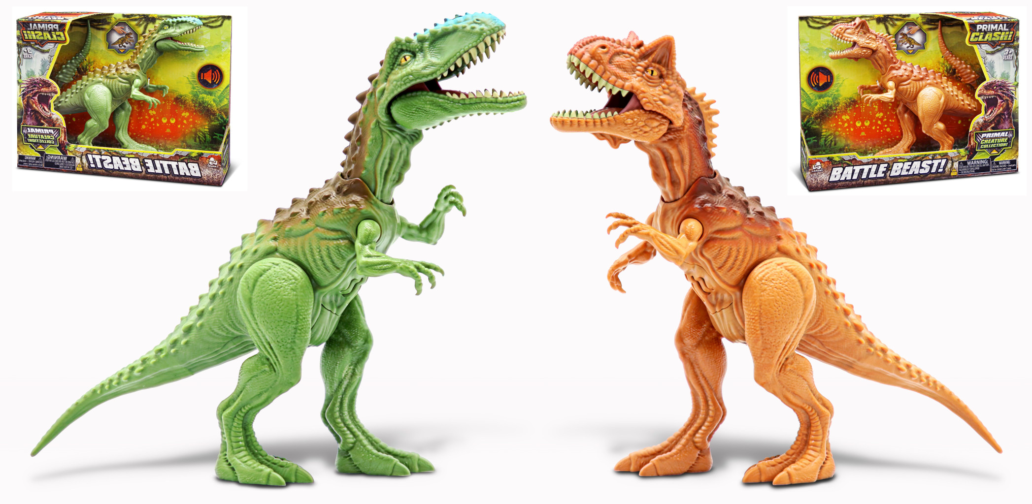 Dotaz na produktPrimal Clash! Bitevní dinosaurus. Velikost figurky 21 cm. Dinosaurus má pohyblivé končetiny, čelist, a vydává zvukové efekty. Aktivace efektů sklopením hlavy. 3xAG13 baterie, součástí balení. 2 varianty - Carnotaurus, Gigantosaurus.