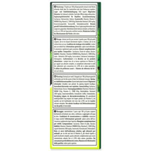 Obsah vitamínů v 1 ml suspense: vitamín A 1000 m.j., vitamín D3 80 m.j., vitamín B1 0,6 mg, vitamín B2 0,86 mg, vitamín B6 0,2 mg, vitamín C 10 mg, vitamín B12 1 mikrog, Nicotinamid 4 mg.