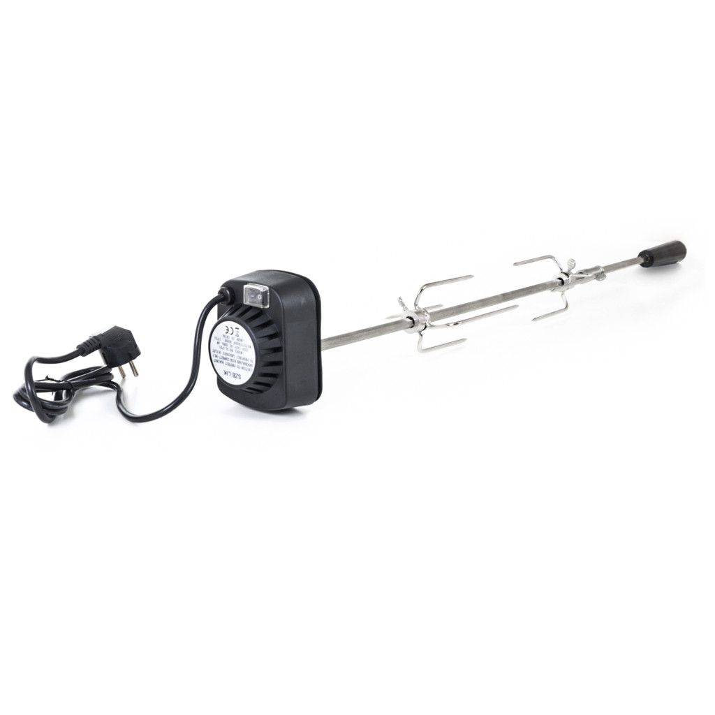 Z jedné strany je jehla opatřena odnímatelným plastovým držadlem, na kterém je praktické očko pro uchycení. Z druhé strany se nachází motorek v plastovém krytu, na kterém je umístěno tlačítko na zapínání / vypínání. Motorek s napětím 230 V jednoduše zapojíte do elektřiny pomocí kabelu v délce cca 125 cm. Motorek s jehlou otáčí rychlostí asi 2 otáčky za minutu, aby se připravovaný pokrm nepřipékal, ale pekl se rovnoměrně.