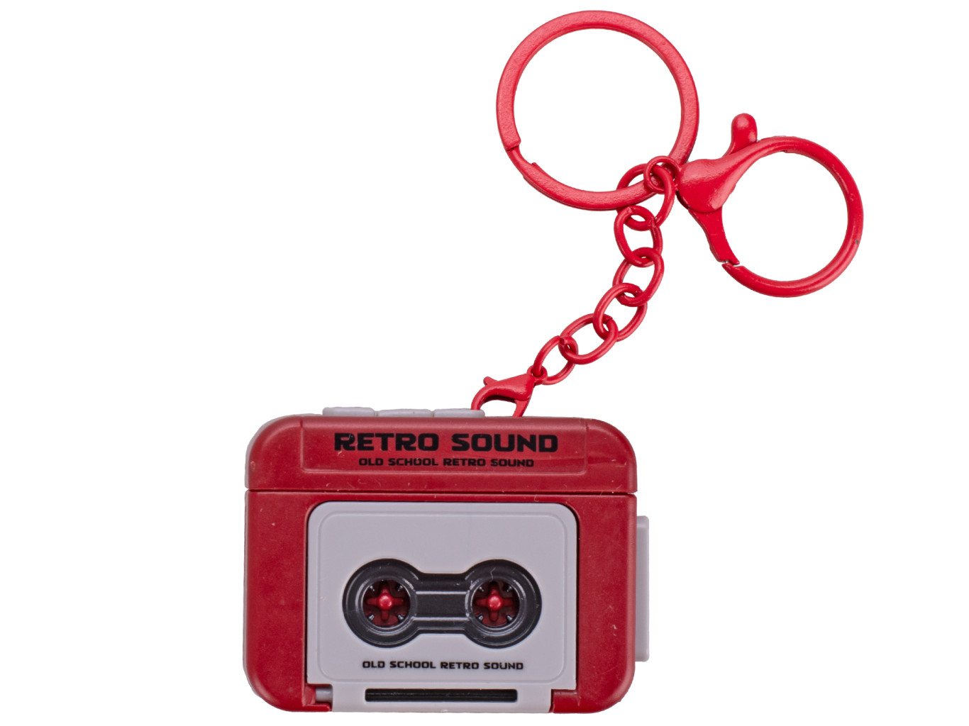 Dotaz na produktPřívěsek na klíče kazetový nahrávač na baterie s hudbou. Velikost 5,5cm. 2 varianty: modrá, červená, baterie 4xLR41,součástí