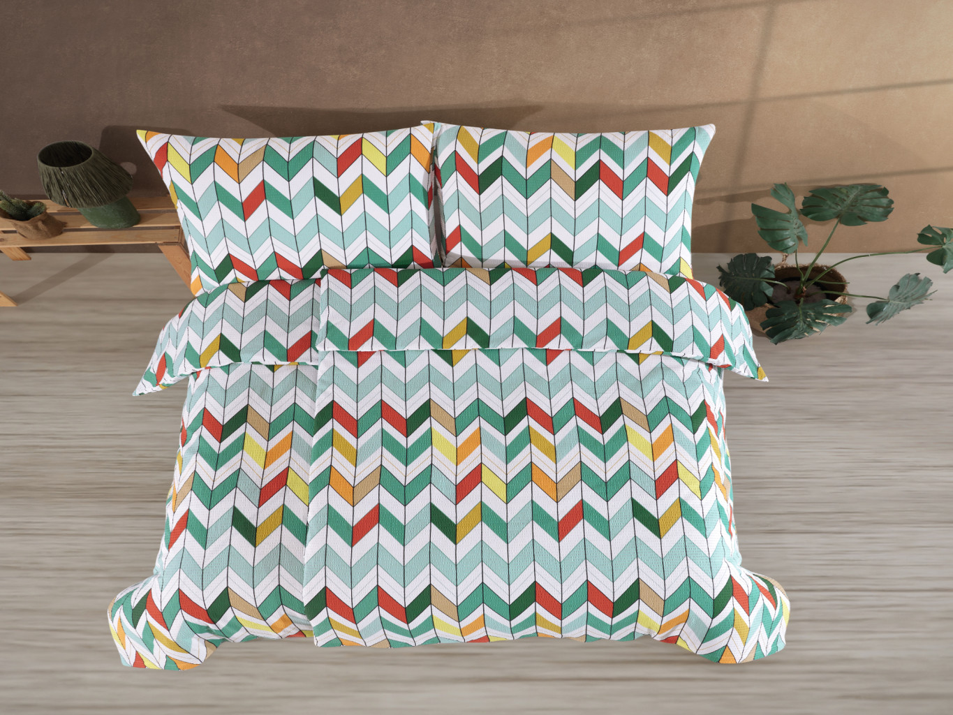 Povlečení Alexis zaujme výrazným geometrickým vzorem ve stylu moderního retro designu. Dominantním motivem jsou pravidelné cikcak pruhy, které vytvářejí dynamický a přitom harmonický vzhled. Barevná kombinace svěžích zelených odstínů doplněná o hořčicovou, žlutou, oranžovou a jemné béžové tóny působí hravě, ale zároveň elegantně. Je ideální volbou pro moderní i skandinávsky laděné interiéry. Oživí neutrální prostor, dodá mu energii a vytvoří příjemnou, útulnou atmosféru pro dokonalý odpočinek.
