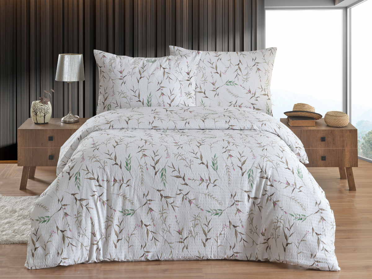 Povlečení pokrývá z obou stran lehký akvarelový tisk drobných větviček a lístků. Na světlém podkladu se jemně kříží hnědé stonky s drobnými poupátky a olivově-zelenými, místy až šalvějovými lístky. Motiv je rozmístěn nepravidelně, takže působí vzdušně a přirozeně – jako lehké opadávající listí v pozdním létě. Celek ladí do teplých, zemitých tónů, které přinášejí do ložnice klidnou, přírodní atmosféru.