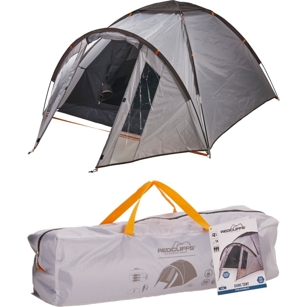 Pevná podlážka z PE materiálu chrání proti vlhkosti od země a zvyšuje komfort při spaní. Stabilní konstrukce ze skelnolaminátových tyčí spolu s kolíky a kotevními lany zajišťuje bezpečné ukotvení i v náročnějších podmínkách. Elegantní kombinace šedých tónů s kontrastními žlutými detaily a logem Redcliffs působí moderně a funkčně.