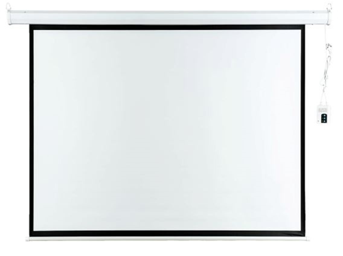 Nástěnné projekční plátno, elektrické rolování, dálkové ovládání s dosahem 40 m. Černé okraje pro zdůraznění kontrastu obrazu, úhlopříčka 100", formát promítací plochy 16:9, rozměry 221,8 x 125 cm.