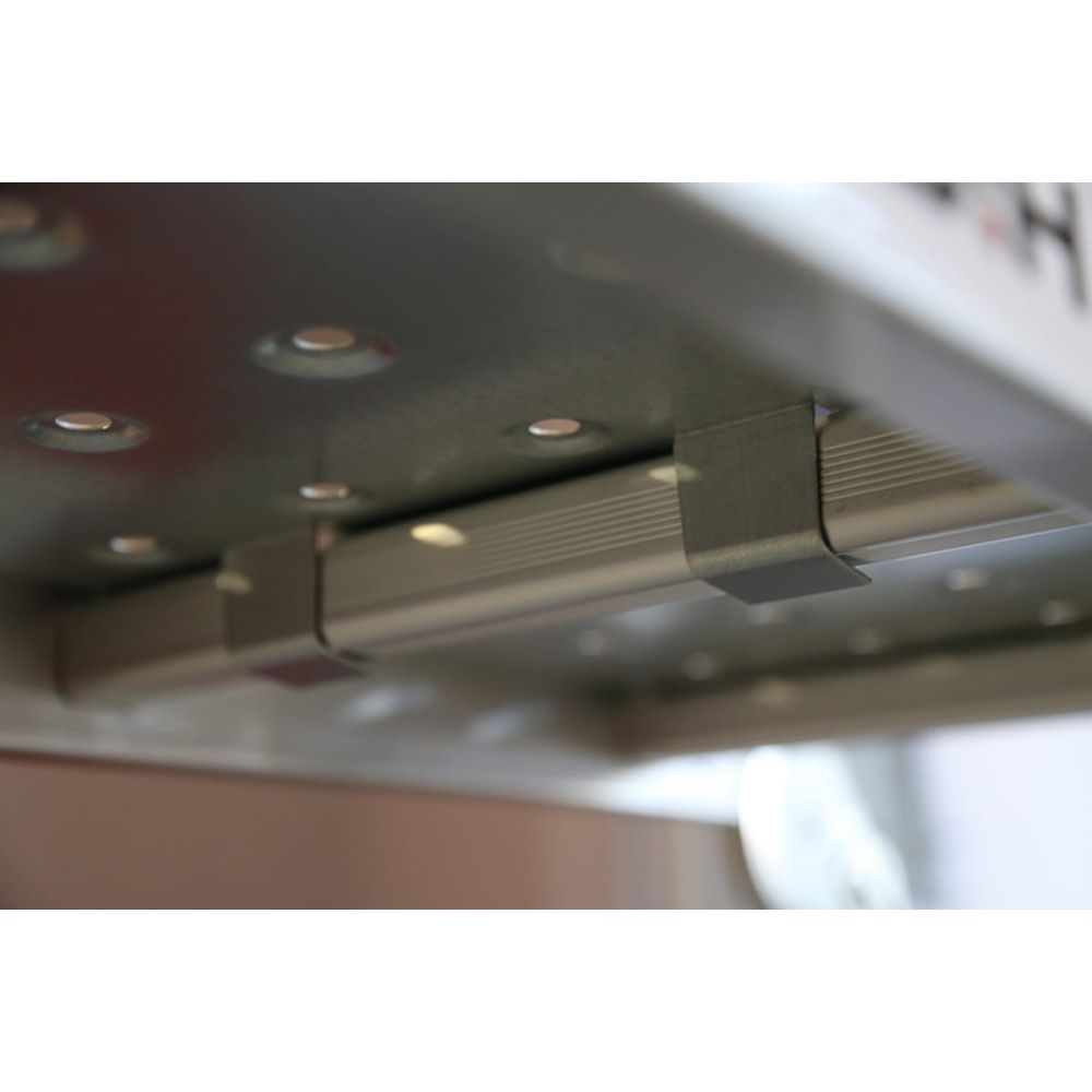 Univerzální dvoudílná plošina pro multifunkční kloubové žebříky. Rozšiřuje možnosti použití žebříků o lešení nebo odkládací plošinu. Masivní pozinkovaná ocel, protiskluzové profilování. Spodní háky pro bezpečné upevnění. 2 díly 89,5x31 cm. Celkové rozměry po složení 200x31 cm.