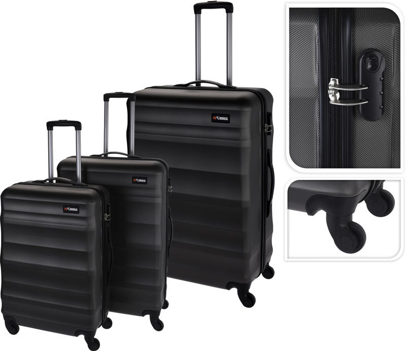 Dotaz na produkt Na splátky ještě dnes- kompletní sada tří kufrů v různých velikostech pro různé příležitosti- odolná cestovní zavazadla se čtyřmi tichými kolečky a TSA bezpečnostním kódovým zámkem- materiál: tvrzený ABS plast- kvalitní, nepromokavý, pevný materiál s dobrou odolností proti poškrábání- teleskopická rukojeť- v horní i boční části také elastické madlo pro ruční přenášení- hlavní velká kapsa na dvojcestný zip se zámkem- bezpečnostní TSA zámek na číselný kód je nejlepším způsobem jak zajistit bezpečí vašeho zavazadla- vnitřní prostor kufru je vybaven elastickými pásy k připevnění obsahu- samozřejmostí jsou 4 kolečka otočná o 360°- skořepinový kufr z tvrzeného ABS plastu výborně odolává případným pádům na zem nebo větší zátěži- malý příruční kufr odpovídá definici příručního zavazadla a lze si jej vzít na palubu letadla- sada obsahuje 3 různě velké kufry:- velký kufr: 51 x 28 x 74 cm- střední kufr: 45 x 25 x 66 cm- příruční: 37 x 22 x 52 cm- barva: antracit- značka: PROWorld.