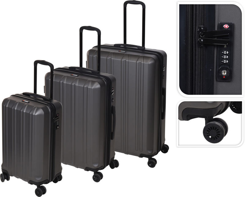 Dotaz na produkt Na splátky ještě dnes- kompletní sada tří kufrů v různých velikostech pro různé příležitosti- odolná cestovní zavazadla se čtyřmi tichými kolečky a TSA bezpečnostním kódovým zámkem- materiál: tvrzený ABS plast- kvalitní, nepromokavý, pevný materiál s dobrou odolností proti poškrábání- teleskopická rukojeť- v horní i boční části také elastické madlo pro ruční přenášení- hlavní velká kapsa na dvojcestný zip se zámkem- bezpečnostní TSA zámek na číselný kód je nejlepším způsobem jak zajistit bezpečí vašeho zavazadla- vnitřní prostor kufru je vybaven elastickými pásy k připevnění obsahu- samozřejmostí jsou 4 kolečka otočná o 360°- skořepinový kufr z tvrzeného ABS plastu výborně odolává případným pádům na zem nebo větší zátěži- sada obsahuje 3 různě velké kufry:- velký kufr: 50 x 31 x 77 cm- střední kufr: 44 x 27 x 66 cm- příruční: 35 x 22 x 58 cm- barva: tmavě šedá- značka: PROWorld.