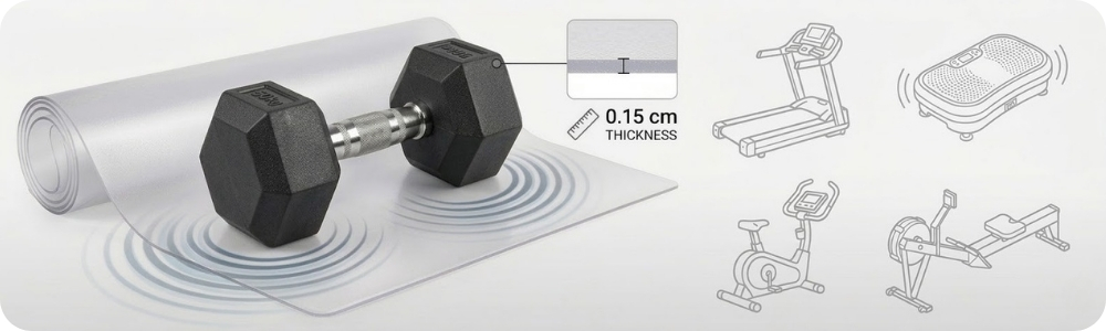 Dotaz na produktCo rozhodně nesmí chybět v posilovně? Průhledná zátěžová podložka inSPORTline Proteko Clear 80 × 70 cm, která chrání podlahu a přitom nijak neruší design místnosti. Díky transparentnímu provedení přirozeně splyne s interiérem a zároveň tlumí vibrace, hluk a nárazy, které vznikají při používání vibrační plošiny, rotopedu nebo dalšího vybavení k posilování.