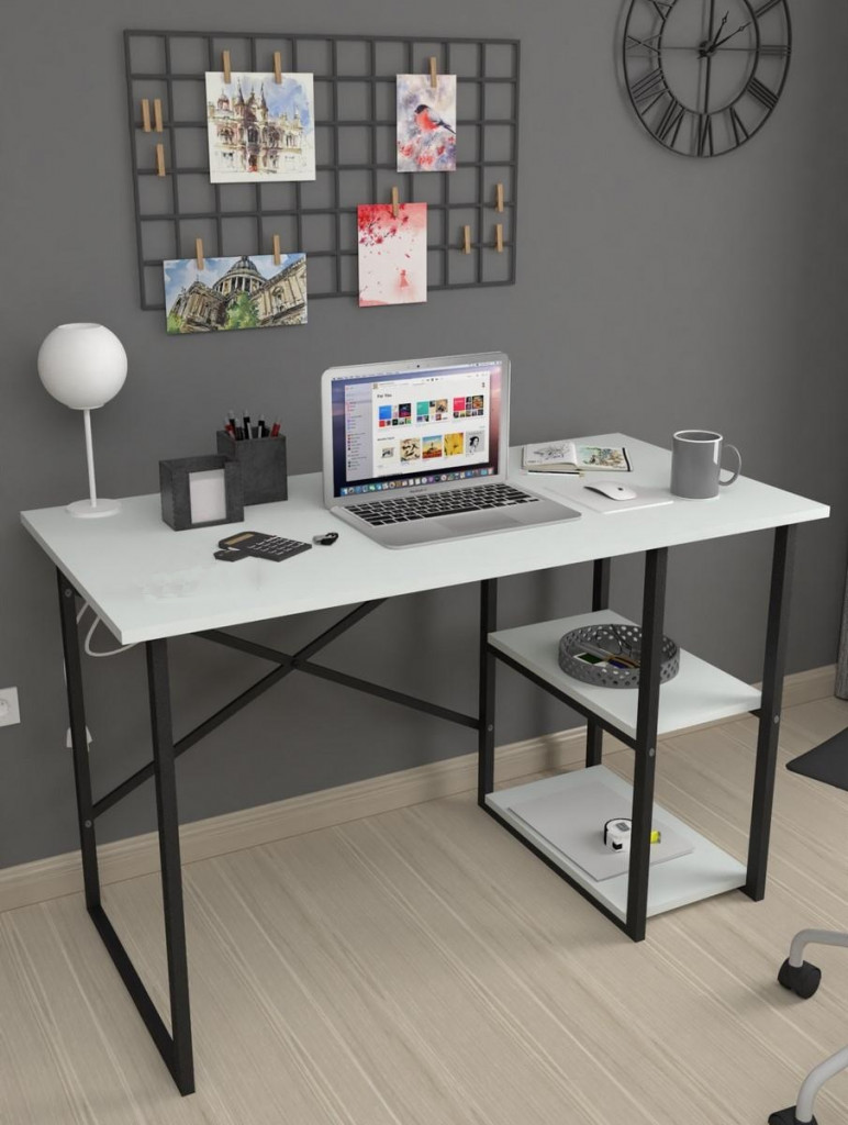 Dotaz na produkt Na splátky ještě dnesStylový psací stůl je z kovového rámu v matné černé barvě, pracovní deska a dvě police jsou vyrobeny z kvalitní LTD desky. Barevné provedení pracovní desky a polic je matná bílá. Možnost dokoupení praktického nástavce. Dodáváme v demontovaném stavu.