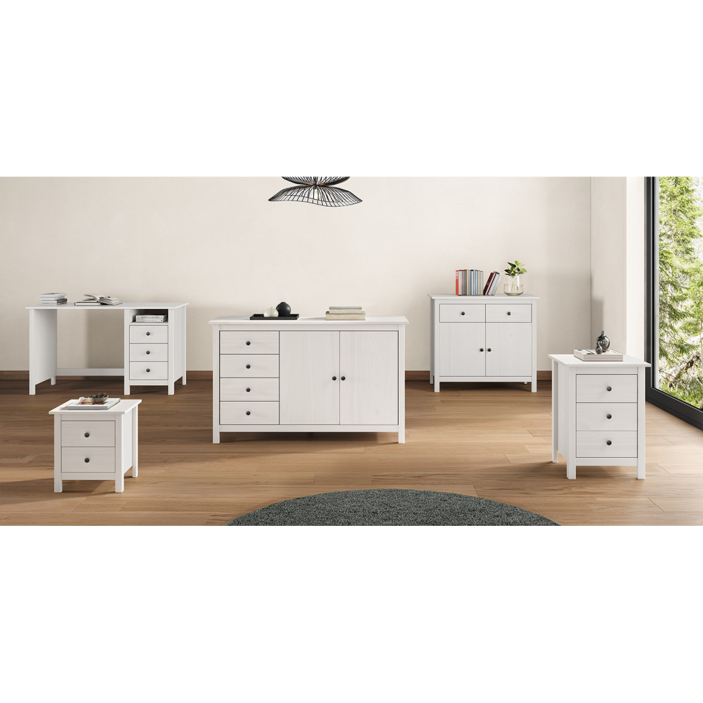 Dotaz na produkt Na splátky ještě dnesmateriál masiv borovice, barevné provedení bílý lak kovové úchytky v barevném provedení černěná mosaz 3 zásuvky s kovovými pojezdy, 1 police