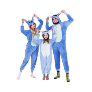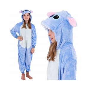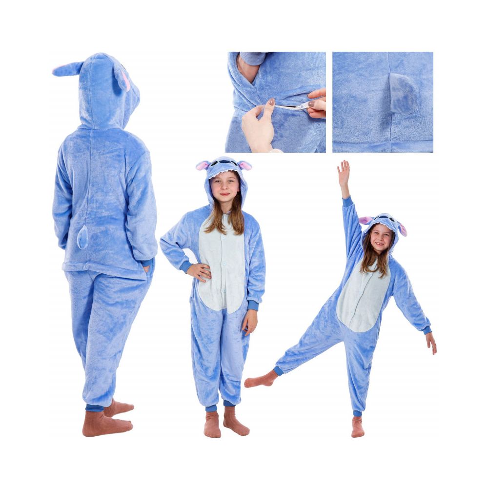 Dětské hřejivé pyžamo s pohádkovým motivem Stitch. Pohodlný overal styl se zapínáním na knoflíky, elastické zakončení nohavic a rukávů. Funční kapuce s ušima, hluboké kapsy, rafinovaný zip pro snadný přístup na toaletu. Perfektní pro každodenní nošení. Skvělé jako pyžamo, denní oděv pro chladné období nebo stylový oblek na maškarní. Velikost 120-130 cm.