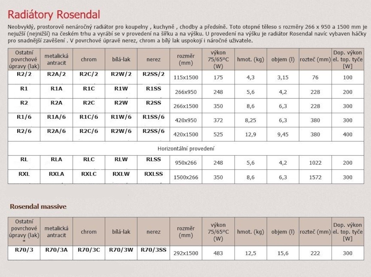 Dotaz na produkt Na splátky ještě dnesRosendal - neobvyklý, prostorově nenáročný a elegantní radiátor, je vhodný nejen do Vaší koupelny, ale i kuchyně, chodby, nebo předsíně. Radiátor je v hnědé barvě. Hmotnost radiátoru je 12,5 kg, objem je 15,6 l, rozteč 222 mm a výkon radiátoru je 483 W.
