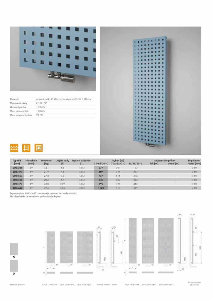 Solar/Solis je elegantní topné těleso k uchycení na zeď. Díky perforovanému krytu je výrazně snížena hmotnost radiátoru, proto se hodí tam, kde je nižší nosnost zdi. Pod lehkým plechovým krytem se ukrývá výkonný radiátor zapojený do centrální topné soustavy s možným středovým i bočním připojením.