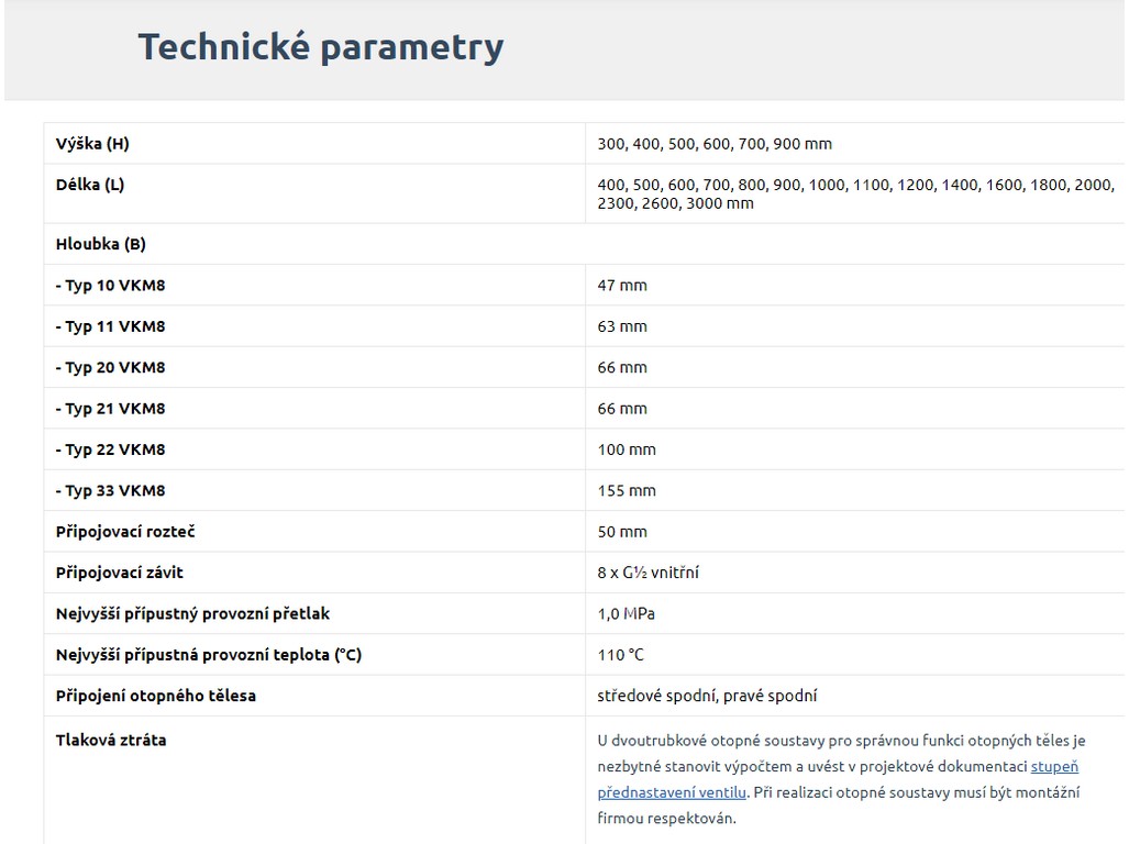 RADIK VKM8 Deskové otopné těleso se spodním středovým nebo spodním pravým připojením Model RADIK VKM8 je deskové otopné těleso v provedení VENTIL KOMPAKT, které umožňuje spodní středové nebo pravé spodní připojení na otopnou soustavu. Typy 20, 21, 22 a 33 mají jednotnou vzdálenost spodního středového připojení od stěny. Ze zadní strany jsou přivařeny dvě horní a dolní příchytky, otopná tělesa o délce 1800 mm a delší mají navař ených šest příchytek.Desková otopná tělesa RADIK VKM8 jsou svou konstrukcí určena pro moderně řešené otopné soustavy s nuceným oběhem teplonosné látky a horizontálně vedeným rozvodným potrubím pod otopným tělesem v podlaze, ve stěně nebo po stěně zakryté lištou.