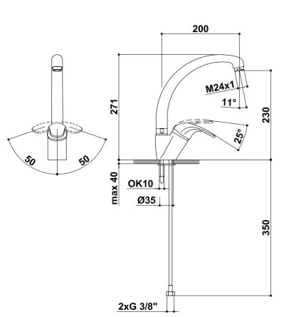 výška 271 mmvývod 200 mmkomfortní zóna 230 mmkartuše 40 mmpovrchová úprava chromaerator M24x1, vnější závitpákové ovládáníotočné ramínkoflexi hadice M10x1 - 3/8", délka 35 cmmontážní...
