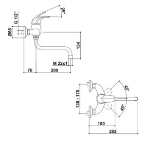 vývod 270 mmdélka výtokového ramínka 200 mmrozteč 150 mmpřipojení G1/2"barva chromkartuše pr. 40 mmovládání pákouramínko kulatéaerátor M22x1, vnitřní závitplastová krytka na kartuširučka k baterii...