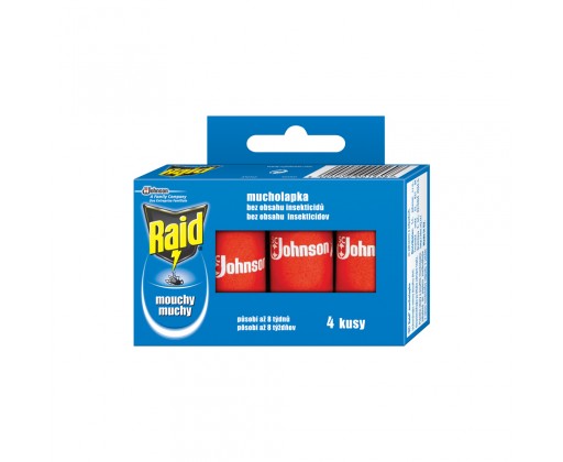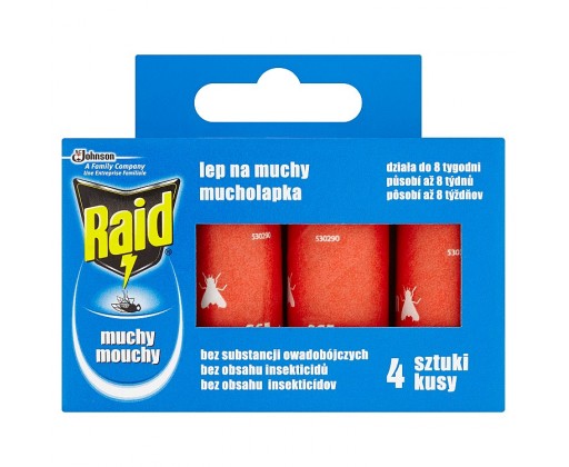 Dotaz na produktRaid mucholapka 4 kusy v balení. Mucholapka je vysoce účinná lepící past na mouchy a další létající hmyz. Její výhodou je, že neobsahuje žádné insekticidy, je tedy vhodná do kterékoli místnosti, ložnice i do dětského pokoje. Mouchy jsou tvarem mucholapky přitahovány a účinné lepidlo je pevně zachytí. Působí až 8 týdnů.