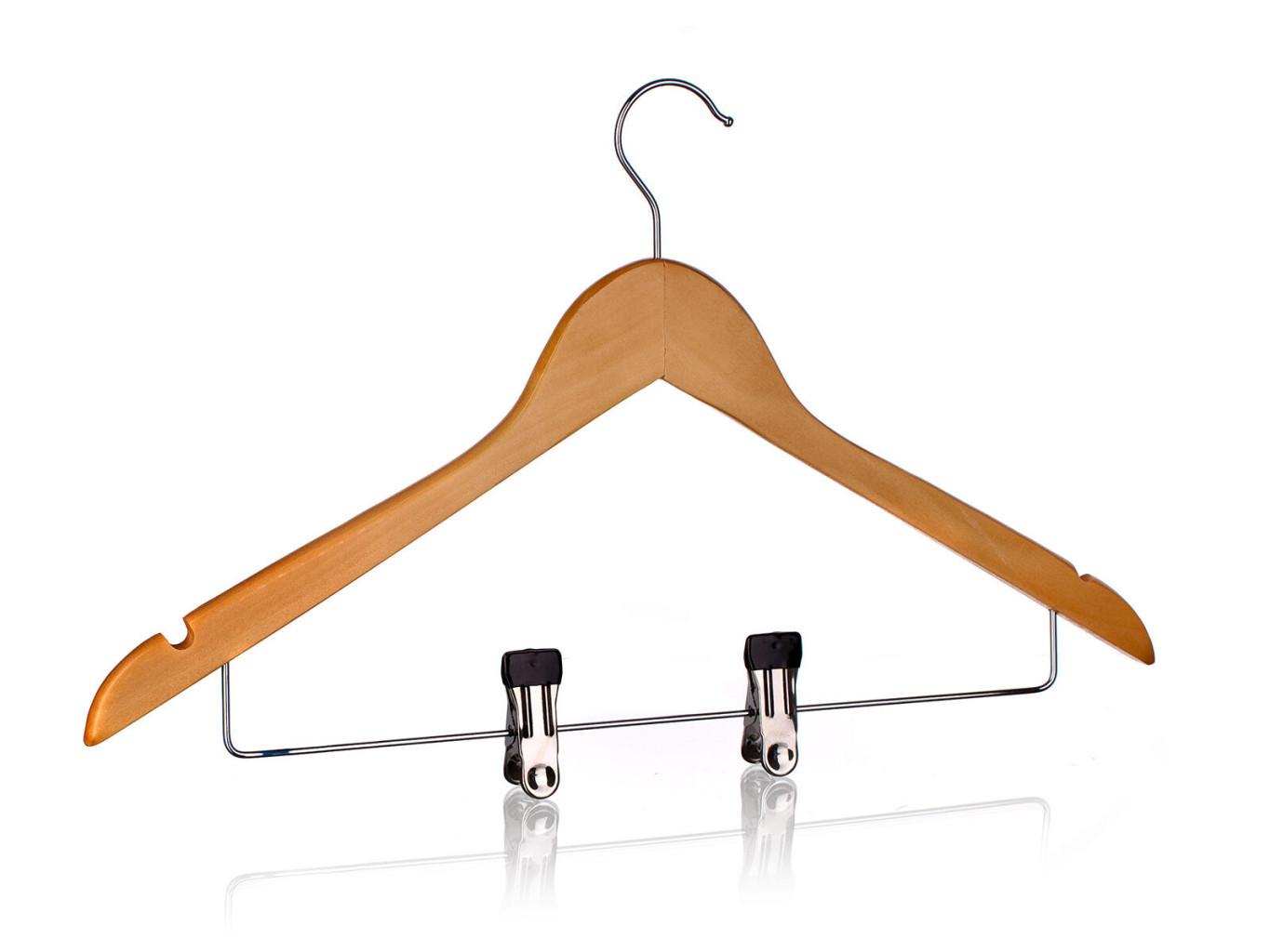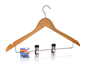 Dřevěné ramínko na šaty a kalhoty s kovovým háčkem a chromovými klipsami na věšení nejrůznějšího prádla.