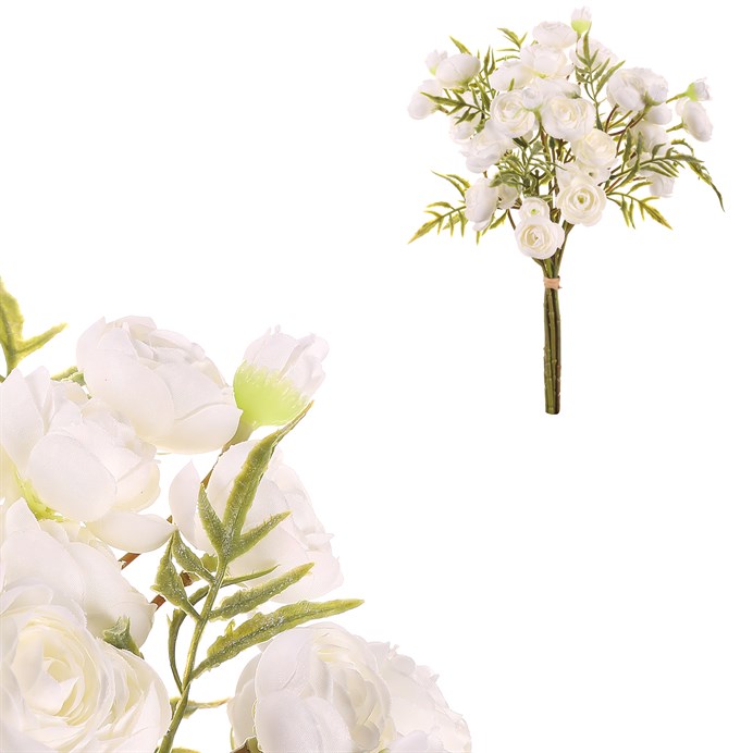 Dotaz na produktUmělá kytice pryskyřníku s drobnými květy v bílé barvě, doplněná umělou zelení, přinese jemnost a svěžest do každého interiéru. Perfektní volba pro dlouhotrvající výzdobu, která nikdy neuvadne.