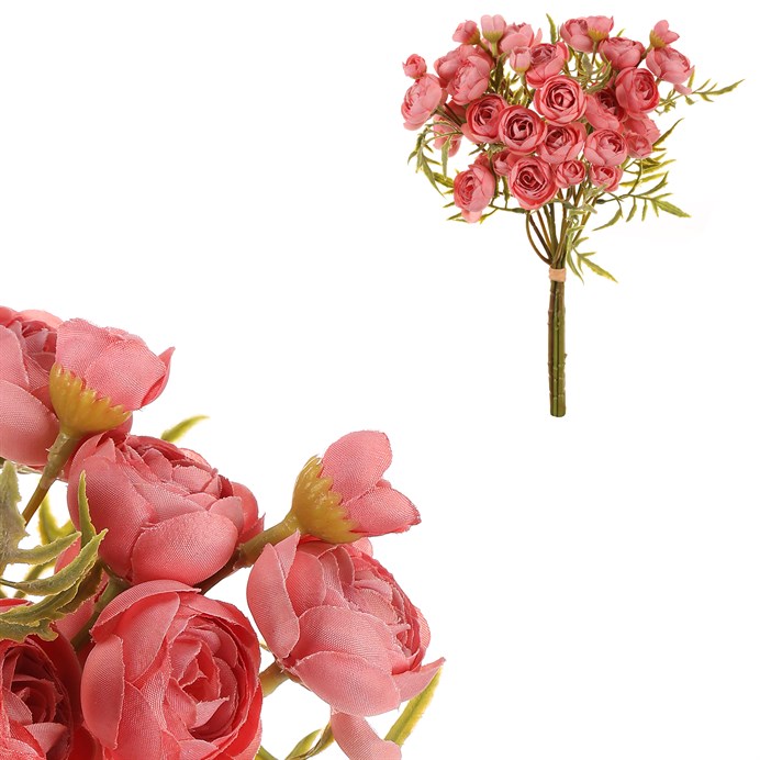 Dotaz na produktUmělá kytice pryskyřníku s drobnými květy ve strarorůžové barvě, doplněná umělou zelení, přinese jemnost a svěžest do každého interiéru. Perfektní volba pro dlouhotrvající výzdobu, která nikdy neuvadne.