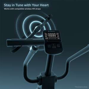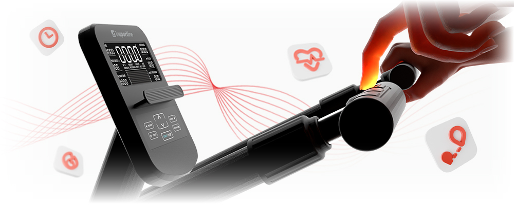 Velký a přehledný displej zobrazuje všechny důležité údaje – čas, vzdálenost, rychlost, kalorie i tepovou frekvenci. Tu můžete měřit pomocí integrovaných senzorů nebo přes Bluetooth hrudní pás (není součástí balení). K dispozici jsou také programy HRC a WATT, orientační test kondice či funkce pro měření tělesného tuku.